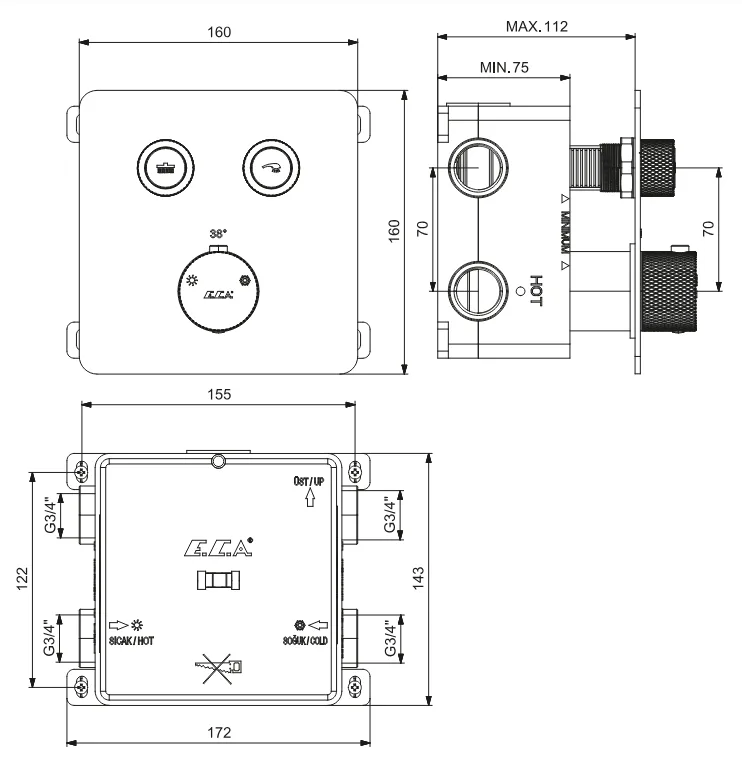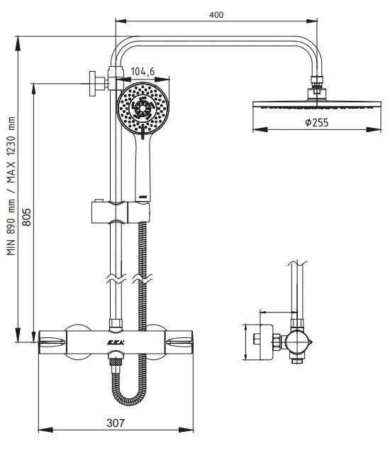 E.C.A DALİA HAREKETLİ ÜST TAKIM 3F PVC SPİRALLİ... Üç fonksiyonlu, kireç kırıcılı, Ø 115 mm Hareketli bar 175 cm burkulmaz pvc spiralli Su akış debisi 3 barda 8,2 L/d’dır Kayar duvar bağlantıları sayesinde istenilen eksen aralığında montaj imkanı